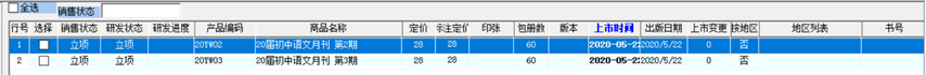 新品和商品的信息在图书行业中,一个系列的商品通常会有大部分的属性相同,如定价、包册数、界别、分类、出版日期、出版社等等,只有个别的属性不同,如新品名称、产品编码、印张等,这种情况下我们可以采用 转同类品 这个功能按钮(第四个)实现快速添加新品信息的操作。首先选中跟新增的新品属性相近的新品信息,点 转同类品 按钮进入到图8转同类品窗口,如图9所示20届初中语文月刊 第3期的商品信息跟20届初中语文月刊 第2期的商品信息大部分类似,只有名称、产品编码信息不同,在图8窗口里将商品信息修改为20届初中语文月刊 第3期,产品编码由20YW02修改为20YW03,以此类推,修改完毕后点 保存 按钮保存新的商品信息,新品信息转同类品成功,该分类会增加了20届初中语文月刊 第3期这个品种(图10)。如果需要走编审流程的新品信息不能在此添加,需要走编务选题立项流程。